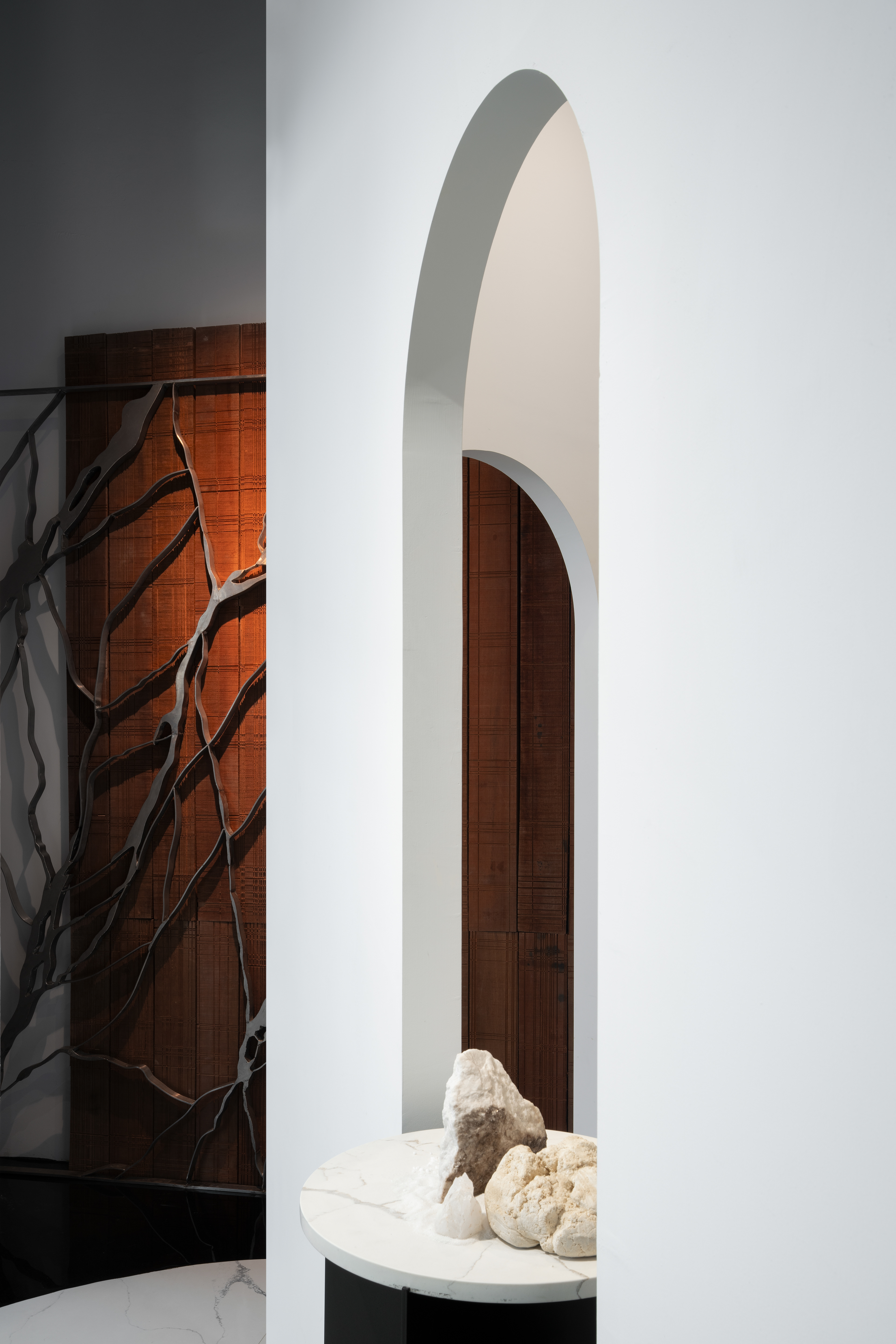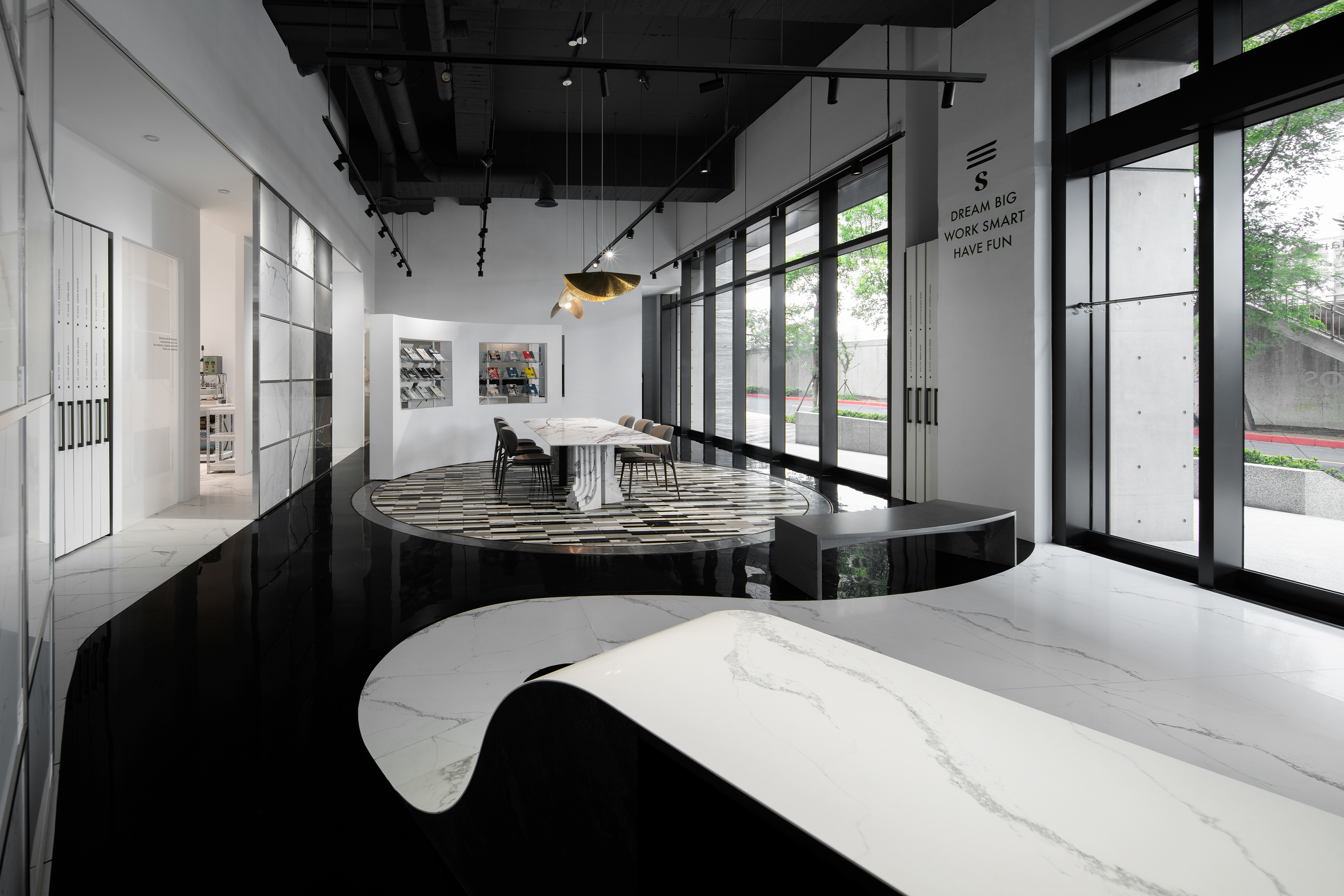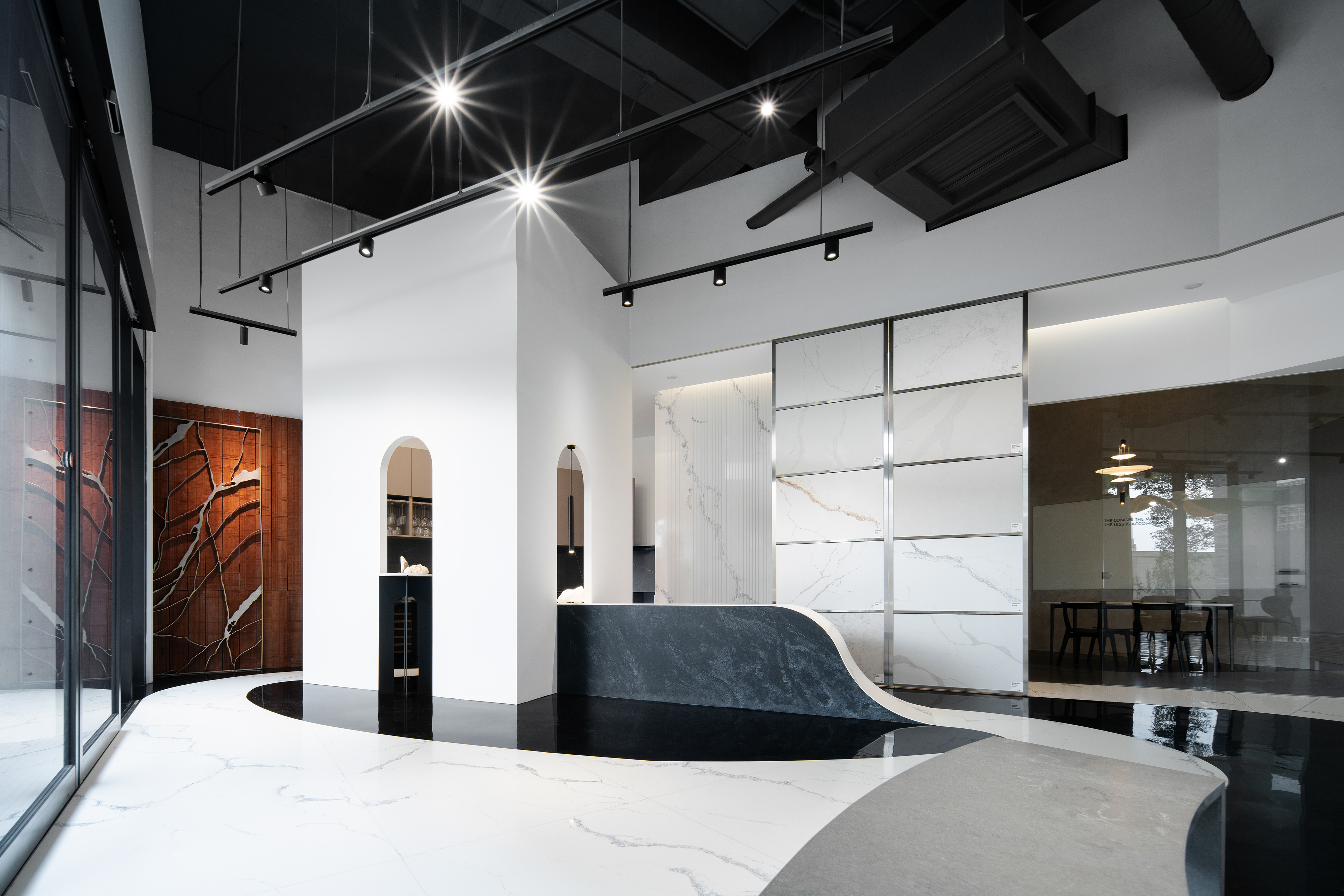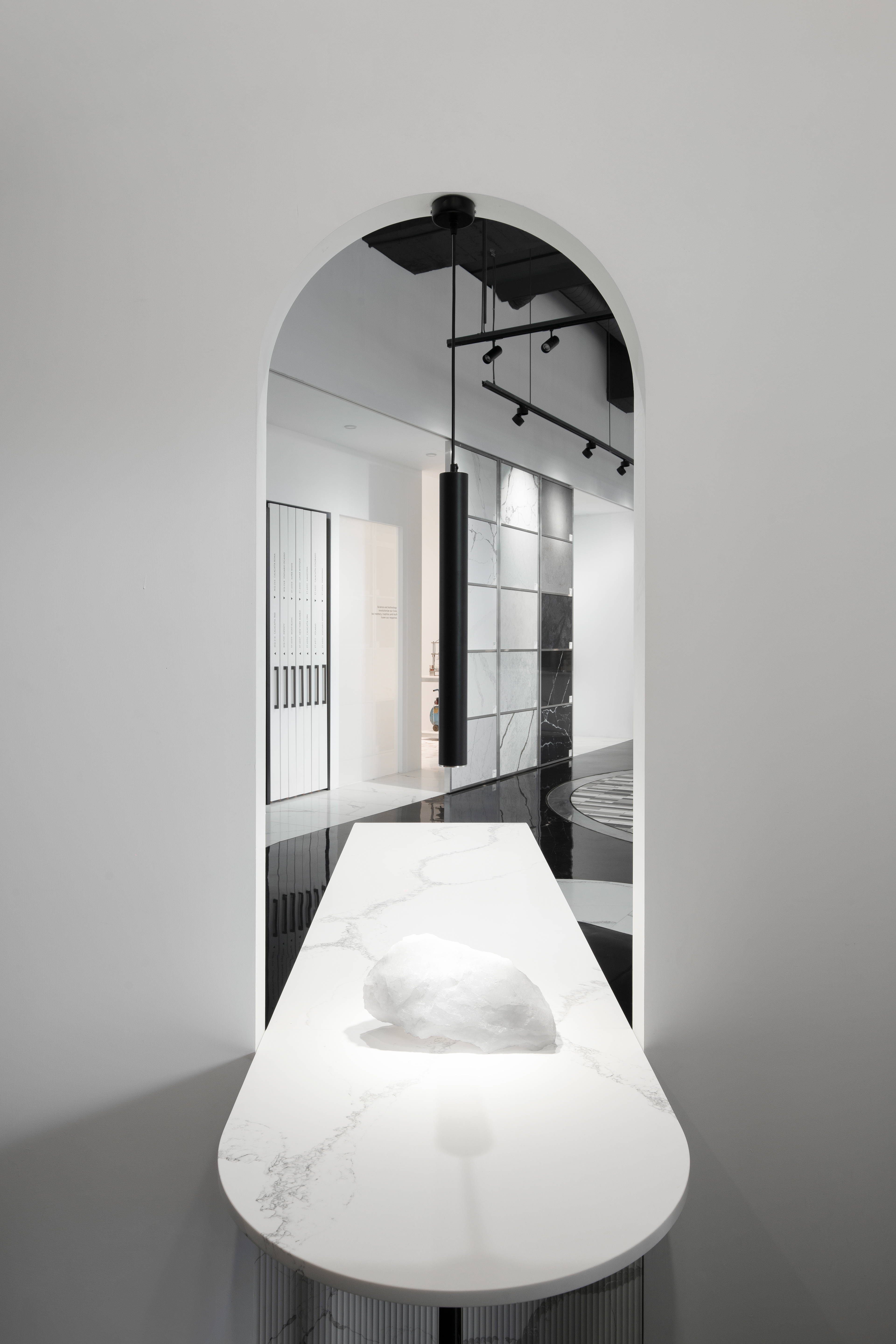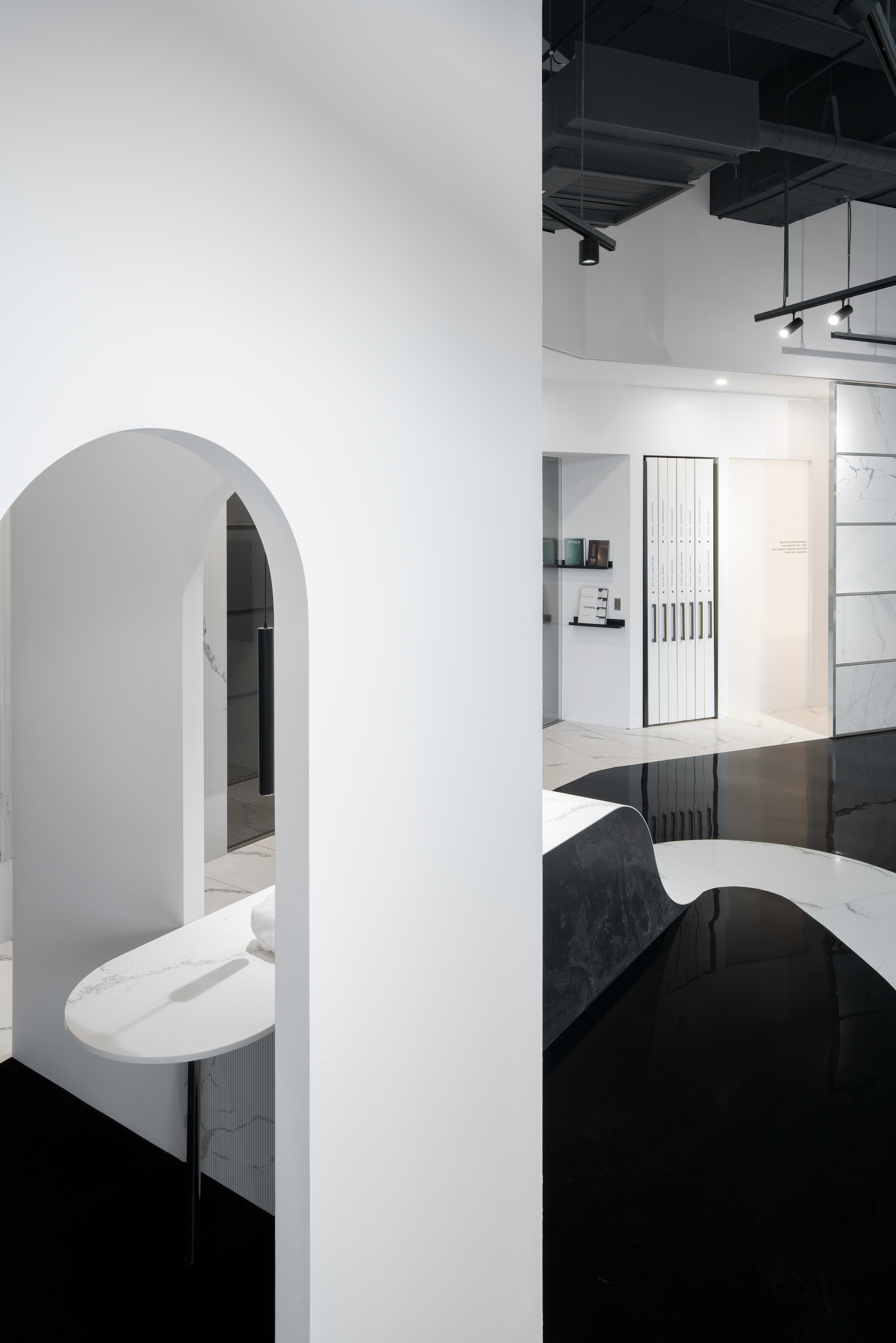 黑地面隱喻園林中的「湖水」;賦予空間大膽卻沉靜的基調;白色石地面則引導參觀動線,將石材最新穎的應用可能展示在沿途的各個角落。